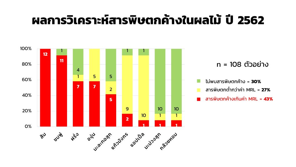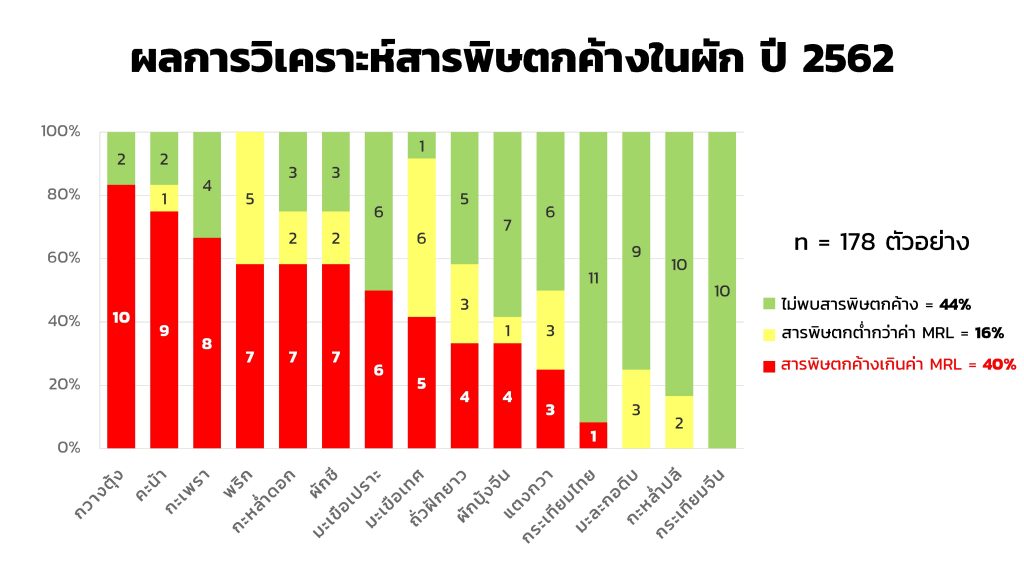 “ผลการตรวจพบว่า ผักผลไม้มีสารพิษตกค้างเกินมาตรฐานสูงถึง 41 เปอร์เซ็นต์ โดยผักที่พบสารพิษตกค้างเกินค่ามาตรฐานมากที่สุดคือ ผักกวางตุ้ง คะน้า กะเพรา พริก กะหล่ำดอก ผักชี โดยพบจำนวน 10, 9, 8, 7, 7, 7 จากทั้งหมด 12 ตัวอย่าง ตามลำดับ ส่วนผลไม้ที่พบการตกค้างมากที่สุด ได้แก่ ส้ม ชมพู่ ฝรั่ง องุ่น โดยพบสารพิษตกค้างเกินมาตรฐานเป็นจำนวน 12, 11, 7, 7 จากทั้งหมด 12 ตัวอย่าง ตามลำดับ”