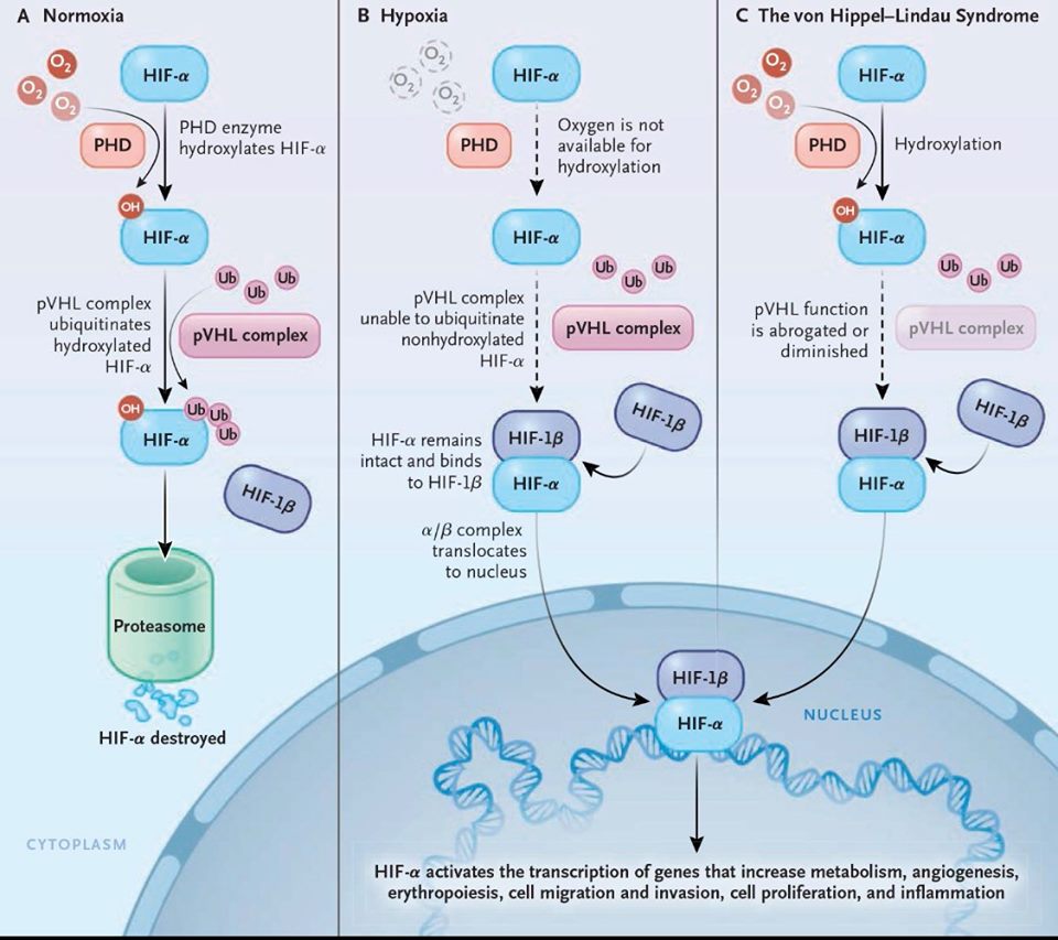 เมื่อมีการแสดงออกของ HIF มากขึ้น โปรตีน HIF นี้ก็จะไปเปิดสวิทของยีนเพื่อให้มีการสร้างโปรตีนอื่นๆ ที่เป็นประโยชน์ต่อเซลล์มะเร็ง เช่น VEGF เพื่อไปกระตุ้นให้มีการสร้างหลอดเลือดใหม่ เพื่อนำเอาออกซิเจนมาที่เซลล์หรือก้อนมะเร็งได้มากขึ้น หรือไปกระตุ้นให้มีการสังเคราะห์ EPO (erythropoietin) ที่ทำหน้าที่ในการกระตุ้นใหม่มีการสังเคราะห์ hemoglobin เพื่อจับกับออกซิเจนมากขึ้น