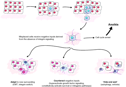 ยิ่งไปกว่านั้น เซลล์ปรกติทั่วไป เมื่อหลุดออกจากเซลล์ข้างเคียง หรือหลุดออกจากที่ยึดเกาะ จะเข้าสู่กระบวนการที่เรียกว่า anoikis คือกระบวนการที่เซลล์เข้าสู่โปรแกรมเซลล์เดท ที่เรียกว่า apoptosis เซลล์ก็จะตาย แต่เซลล์มะเร็งมีคุณสมบัติที่ฆ่าไม่ตายคือมันเป็นกระบวนการที่เรียกว่า anoikis resistance ทำให้ยังมีชีวิตอยู่ แล้วก็กระจายตัวออกจากรังหรือก้อนมะเร็ง คืบคลานไปยังอวัยวะอื่นๆ ได้ทั่วไป