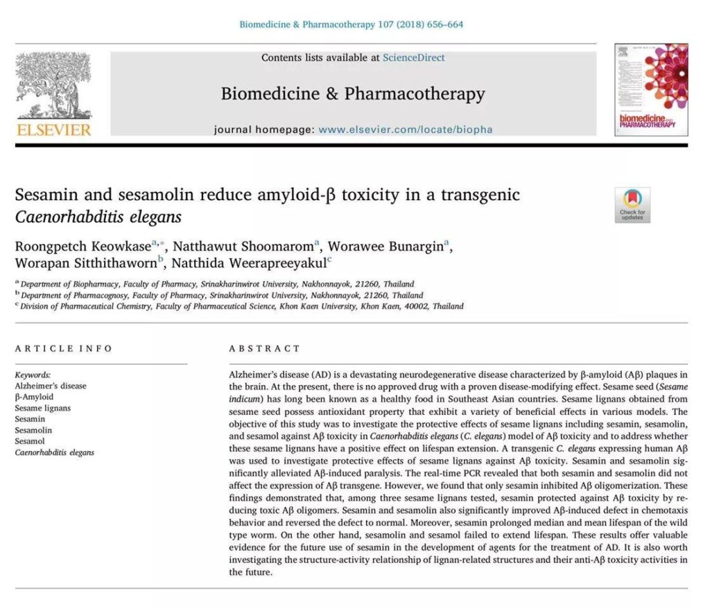 Research Paper: Sesamin สามารถลดความเป็นพิษของ Beta-amyloid peptides ที่เป็นสาเหตุหลักของโรคสมองเสื่อมได้